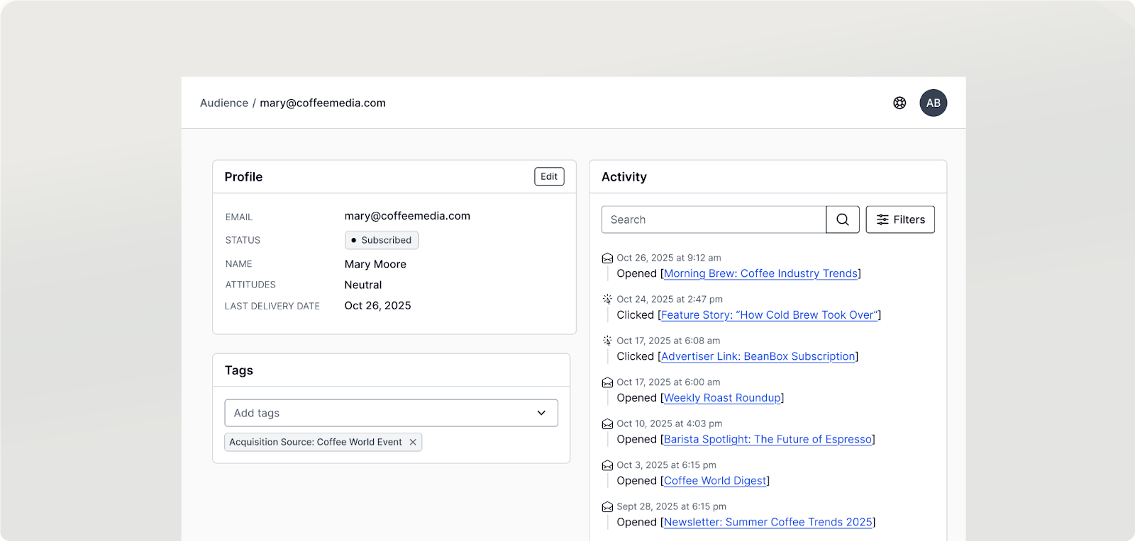 You’ll find the Activity Log on each subscriber’s Audience Profile page. It shows a chronological record of every tracked event with timestamps and links to the exact newsletters they came from.By default, you’ll see the most recent 30 days of activity, but older data is always available for audits or long-term analysis. You can filter by event type or date range to get to the right answer fast. This means when engagement dips, editors can check who opened, clicked, or dropped off. And when it’s time to evaluate overall health, teams can see trends across the full subscriber lifecycle.