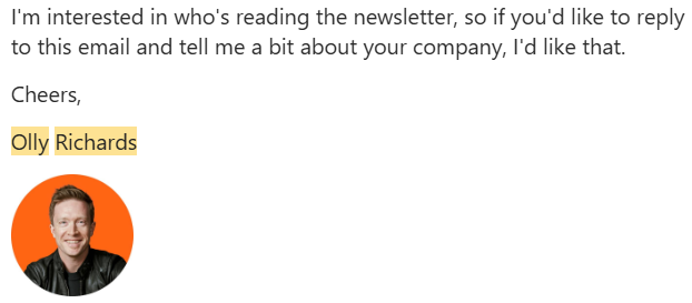 Many newsletter operators encourage engagement in their welcome email. Here’s how Olly Richards does this in a non-threatening way in his welcome email: