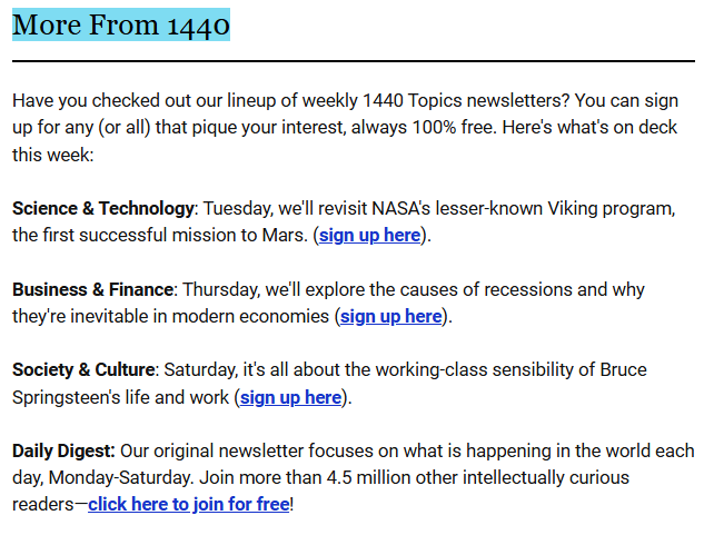 The first step would be to ask the leads if they want to opt in to your newsletter. For example, here’s how 1440 promotes their other newsletters inside their primary publication: